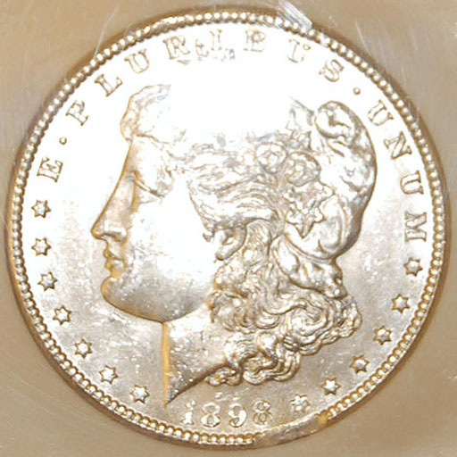 Right: 1898-O Morgan Dollar, NGC MS 63 with mint error (curved clip at 5:00).