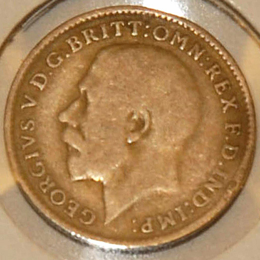 Left: 1918 United Kingdom King George V 3 pence, KM# 813.