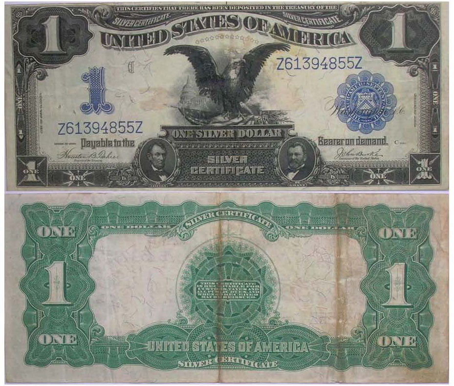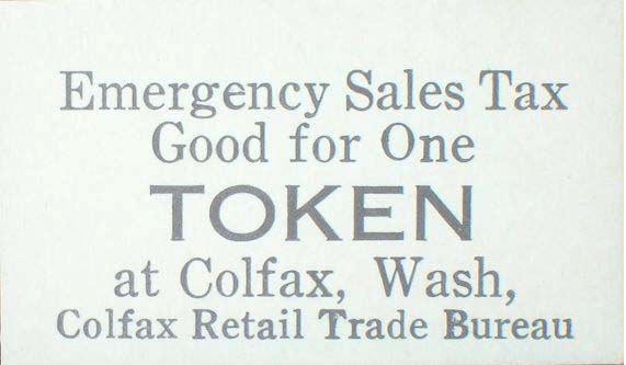Left: 1899 "Black Eagle" $1 Silver Certificate. Right: Emergency sales tax token, Colfax, WA. Issued May 1935.