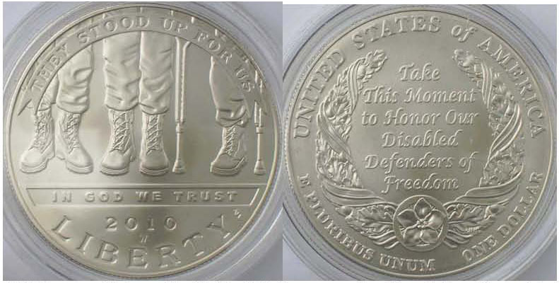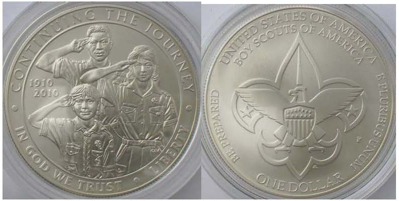 Left: 2010 Boy Scouts of America centennial commemorative dollar. Right: 2010 Disabled American Veterans commemorative dollar.