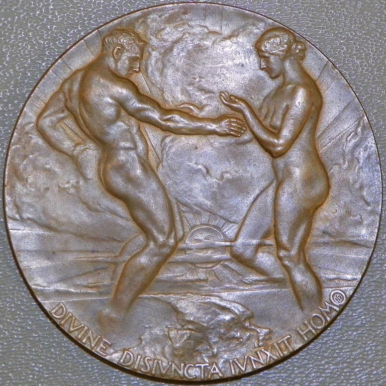 Center: "Divine Homo" man and woman art medal.