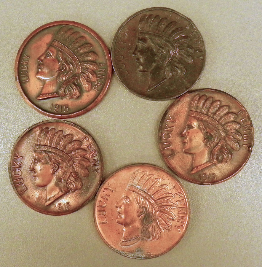Lucky or Souvenir "Pennies" of various designs including 1915 Panama-California Expo and Mt. Rainier.