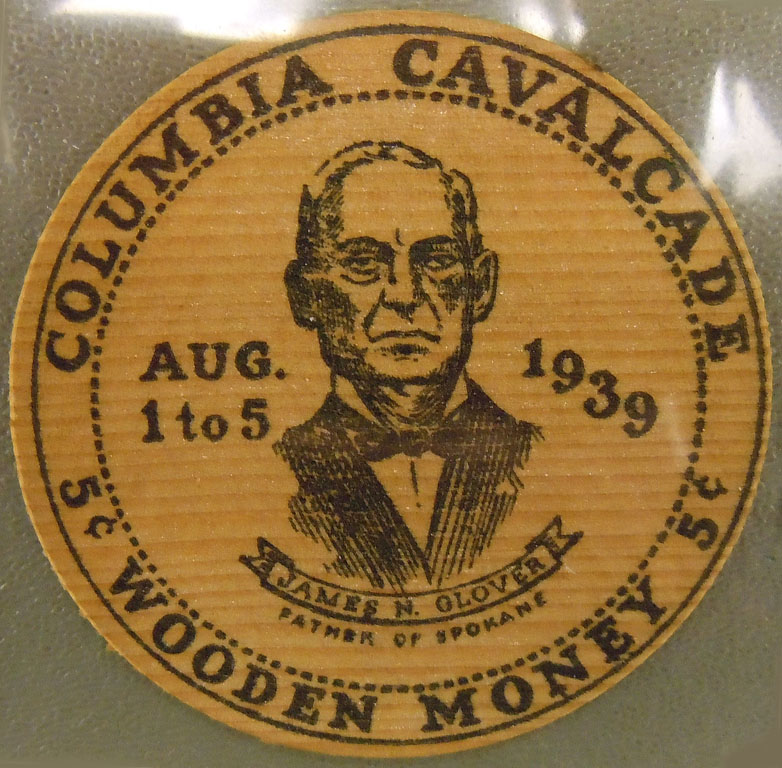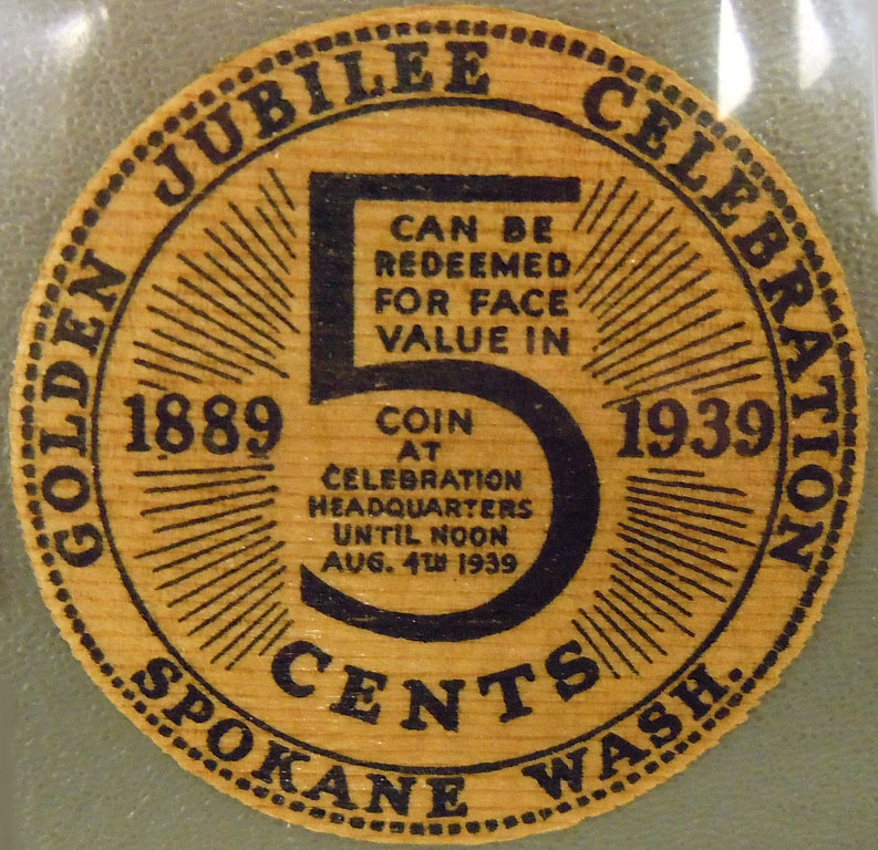 Left: 1939 Spokane, WA 1889-1939 Columbia Cavalcade/Golden Jubilee wooden money.