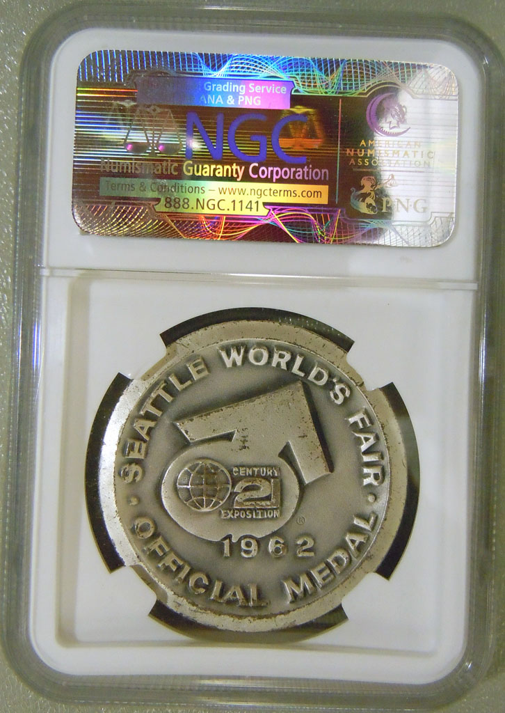 Center: 1962 Seattle World's Fair "World of Entertainment" medal, NGC MS 65.