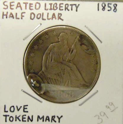 Right: 1858 Seated Liberty Half Dollar love token ("Mary").
