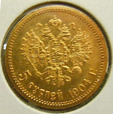 Left Center: 1904 Russian 5 Roubles gold coin.