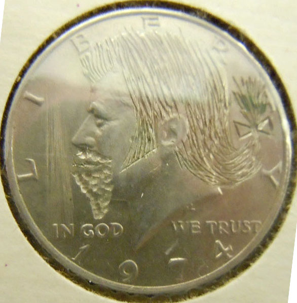 Right: 1974 Kennedy Half with Hobo-style engraving of beard and hair.