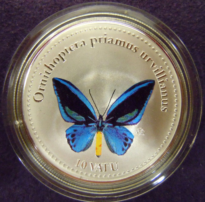 Right: 2006 Vanuatu 10 Vatu coin with colorized butterfly.