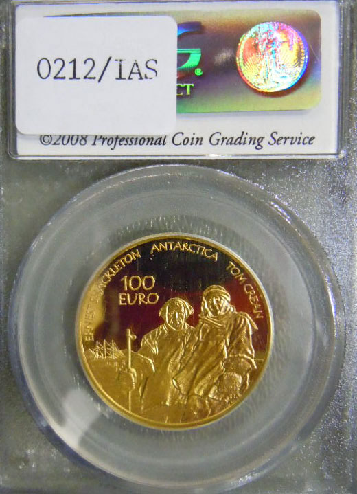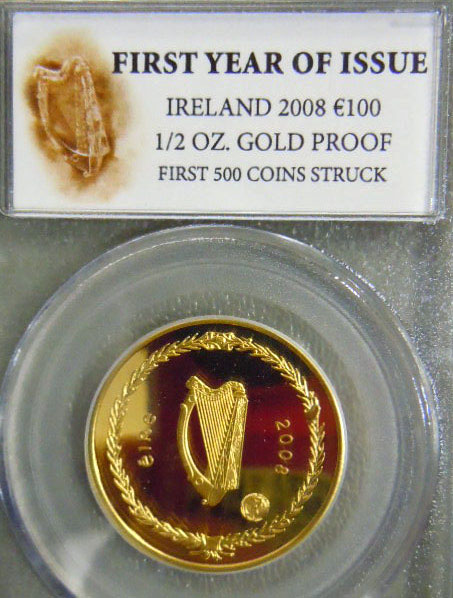 Center: 2008 Ireland first year of issue €100 1/2 ounce gold proof coin.