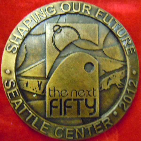 Century 21 pin, original State of Washington oval medal, 2012 50th anniversary medal.