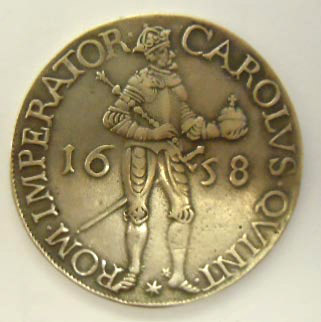 Left: Copy or forgery of 1658 European coin depicting Carolus (King Charles).