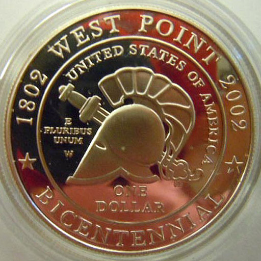 Right: 1802-2002 West Point Bicentennial commemorative silver dollar.