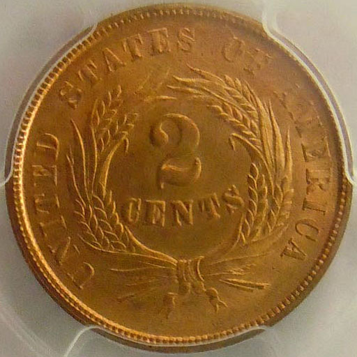 Right: 1864 Two Cent Piece (Large Motto), PCGS MS65RD with CAC sticker.
