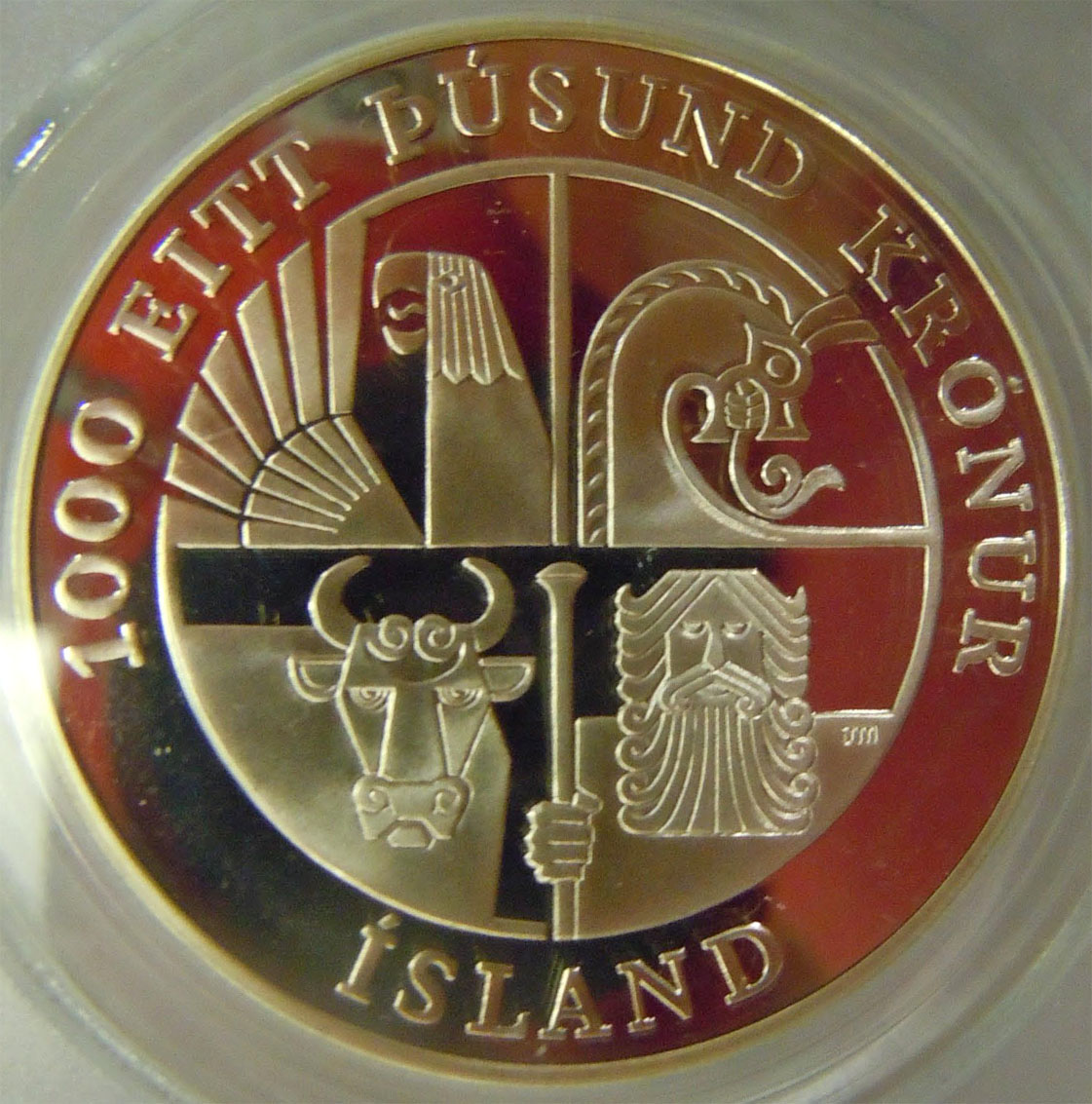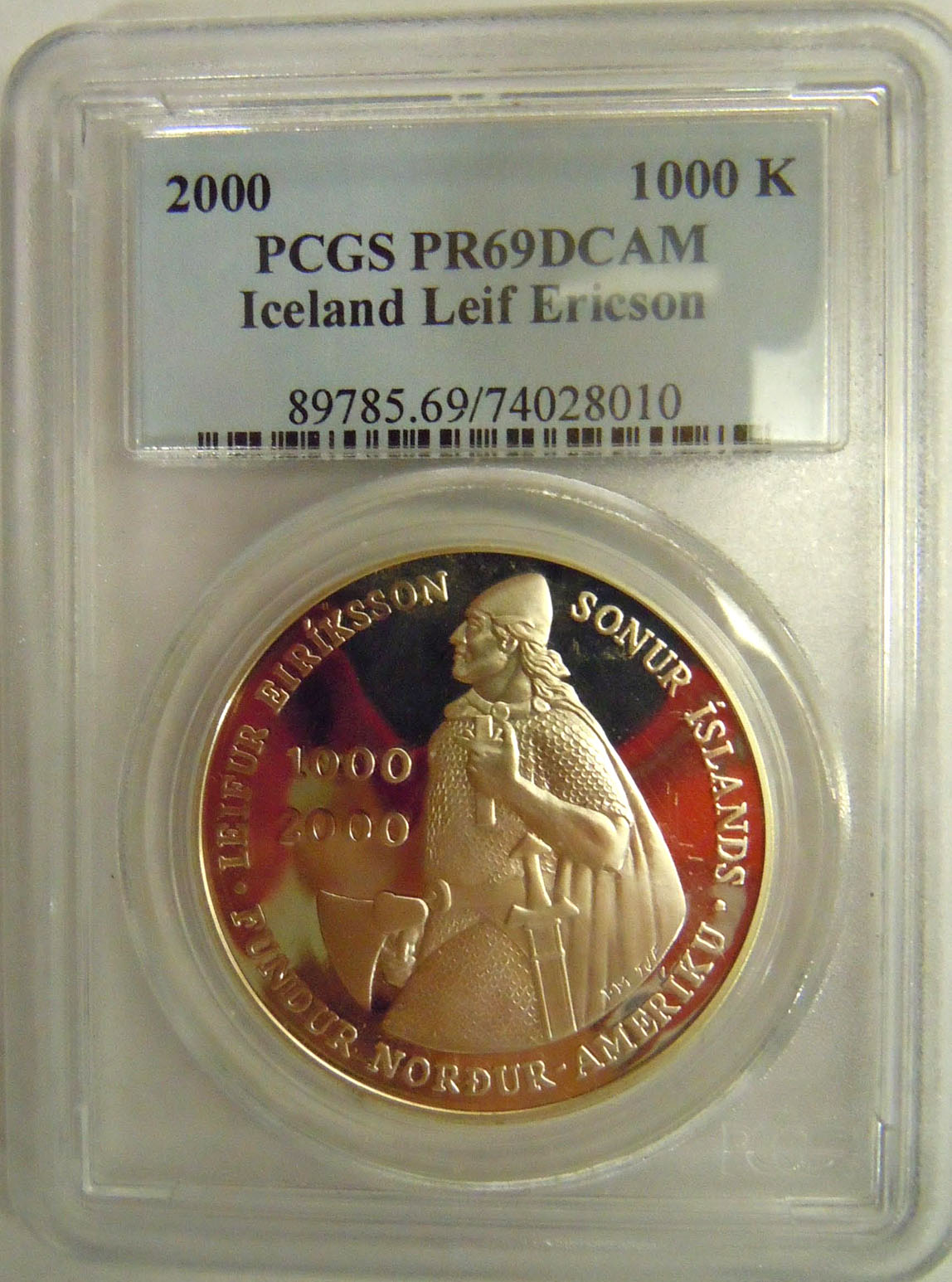 Right: 2000 Iceland 1000 Kroner coin commemorating Leif Ericson, PCGS PR69DCAM.