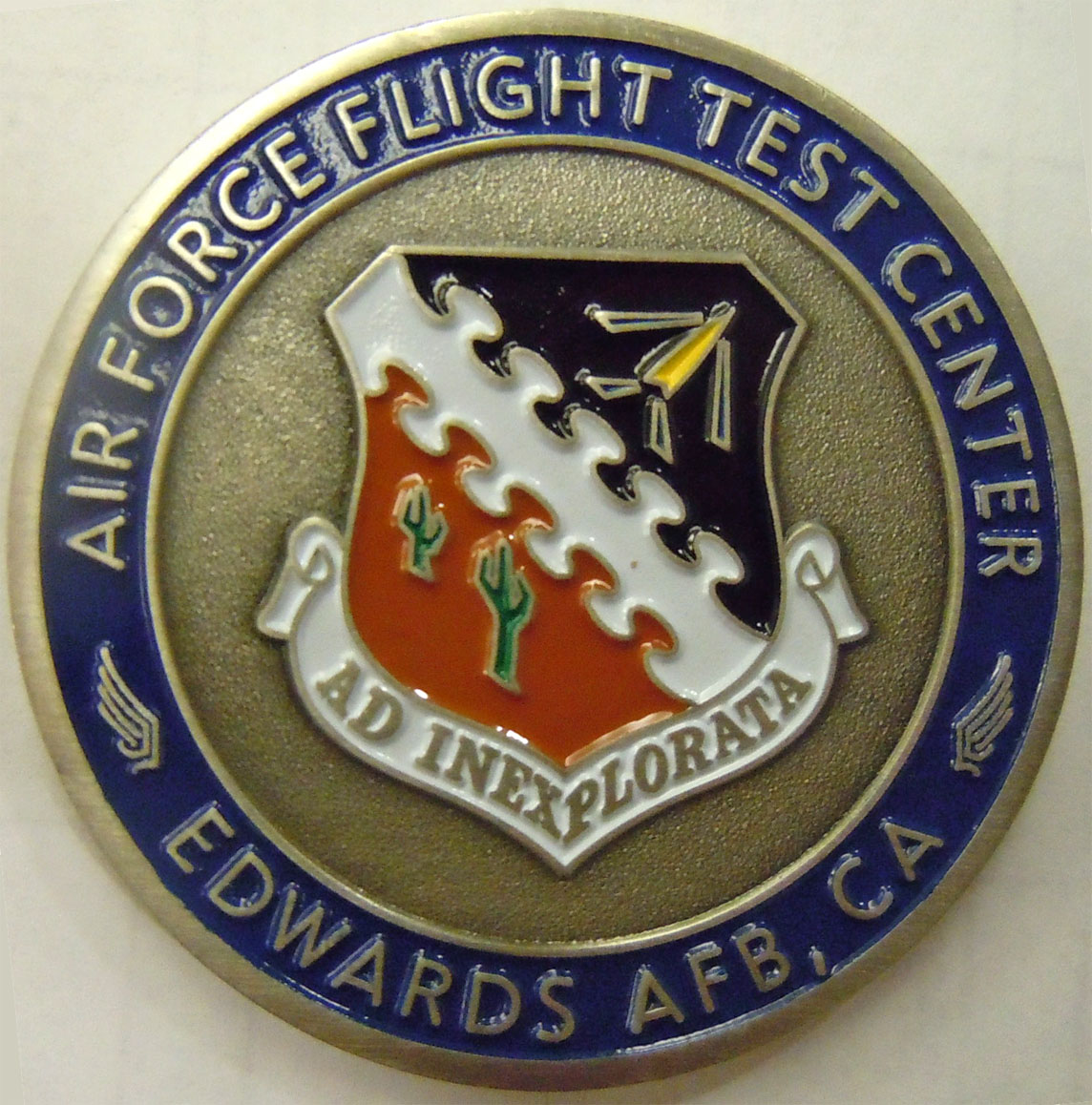 Right: Air Force Flight Test Center, Edwards AFB, CA challenge coin.