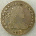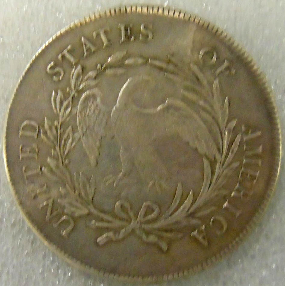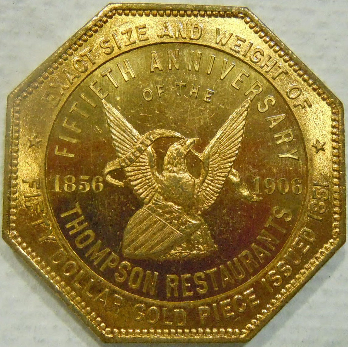 Left: 1796 Silver Dollar, PCGS Questionable (not slabbed). Right: 1906 Thompson Restaurants souvenir resembling 1851 $50 gold piece.