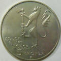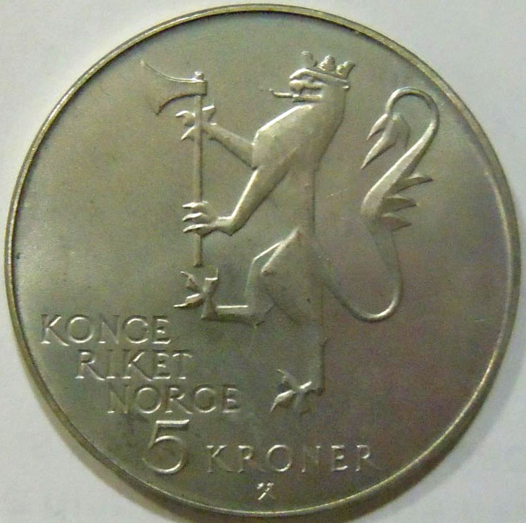 1975 Norwegian 5 Kroner coin commemorating 150 years of organized emigration from Norway.