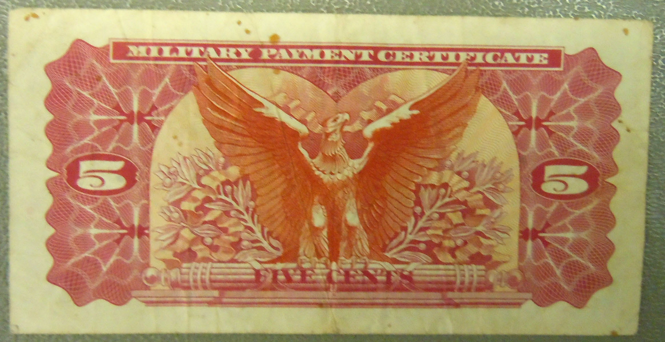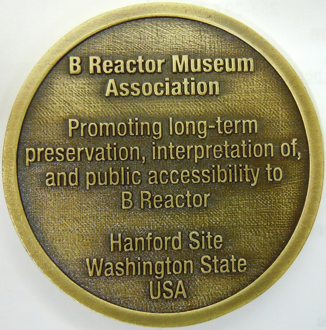 Left: Series 692 5 cents Military Payment Certificate. Right: B Reactor Museum Association (Hanford, Washington) medal.