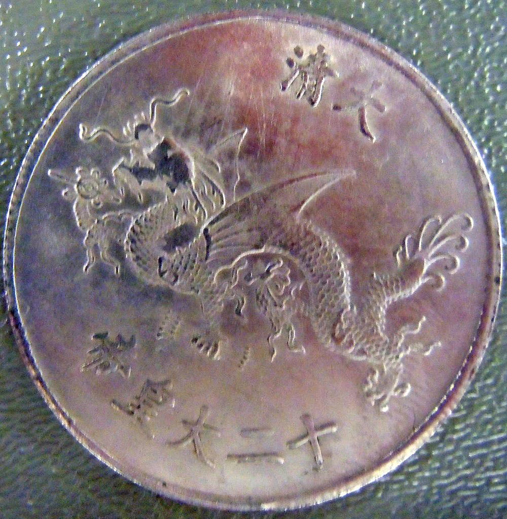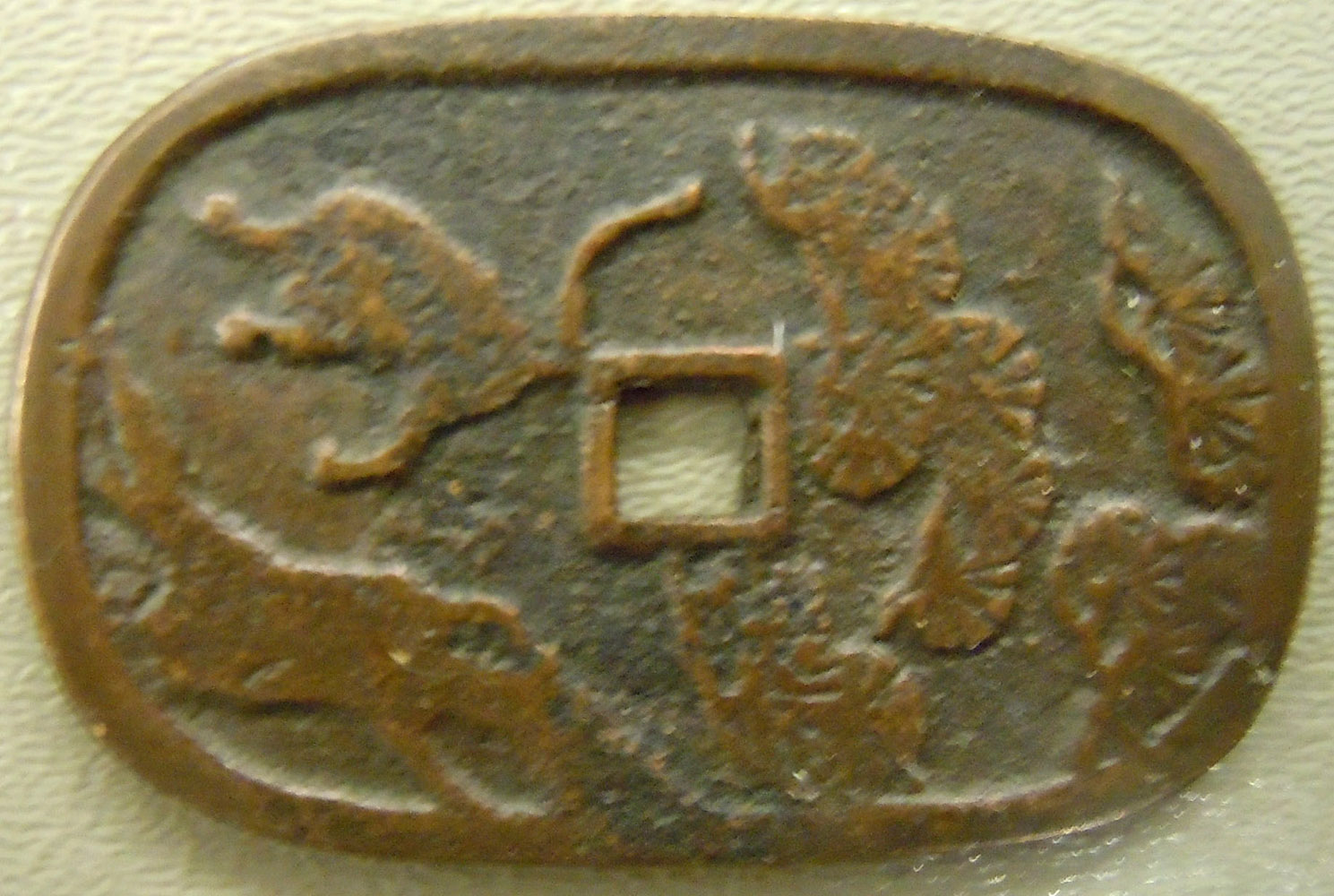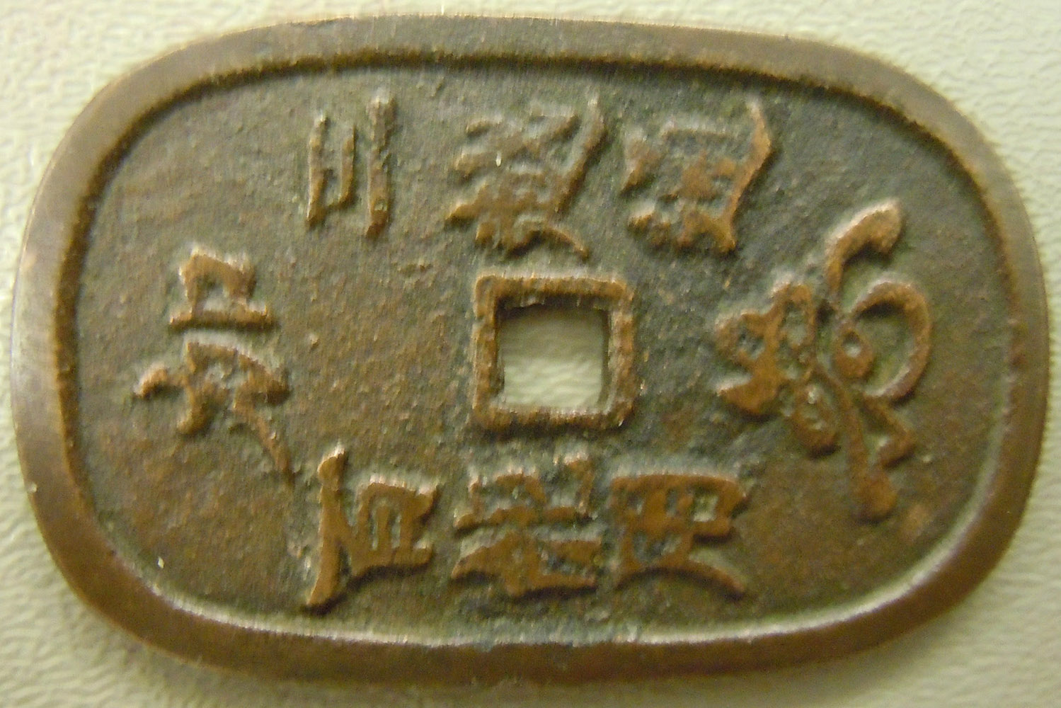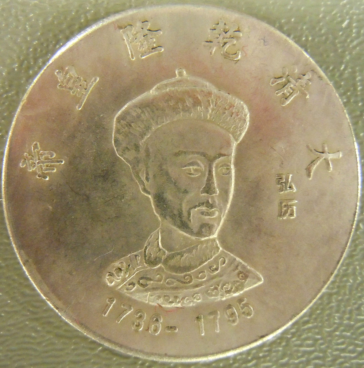 Top row: Emperors of China commemorative medals and ? (at right). Bottom row: Chinese oval-shaped cash coin (replica?).
