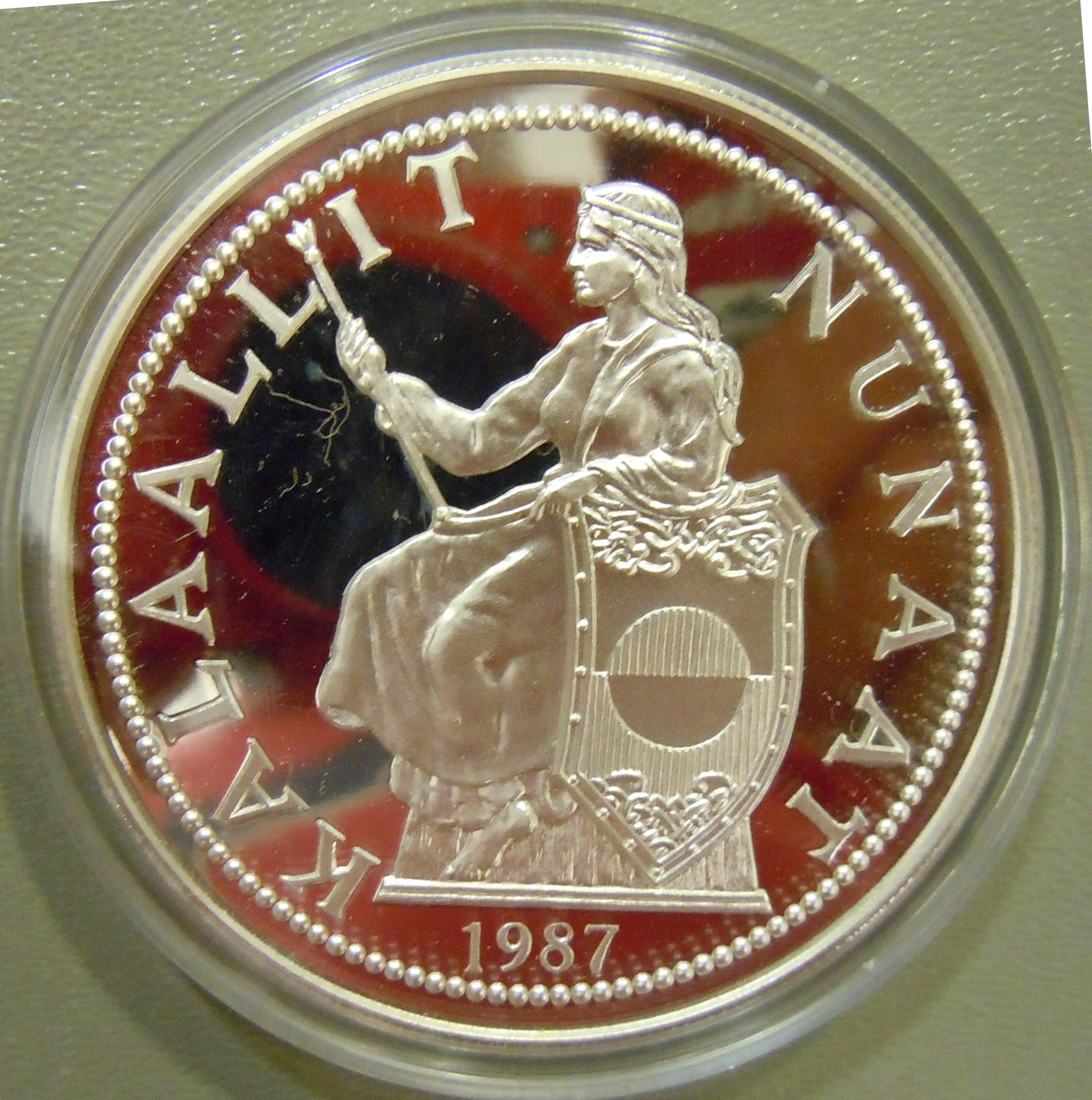 Right: 1987 Greenland 5 piaster 5-ounce silver coin depicting a polar bear.