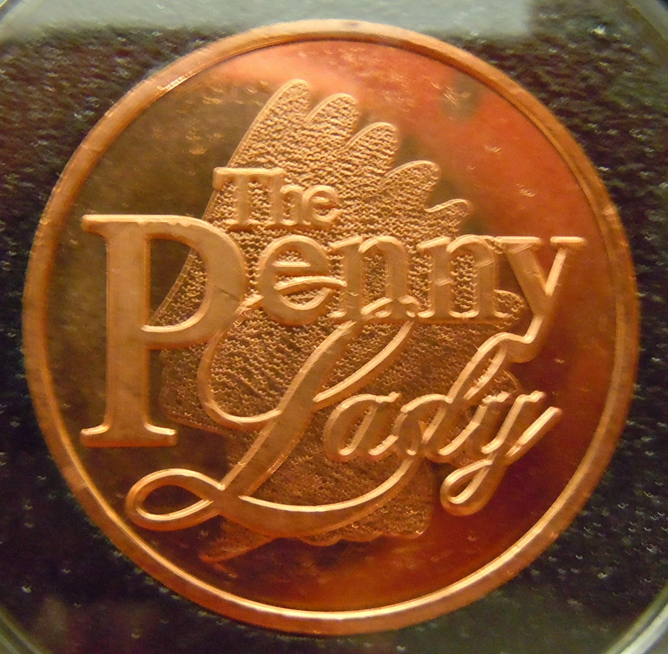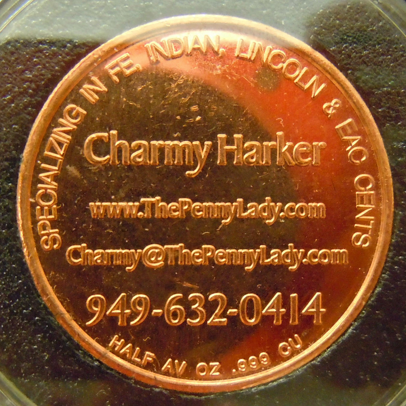 Right: Charmy Harker / "The Penny Lady" copper advertising token.