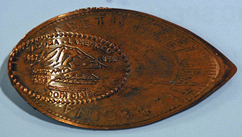 TLCC elongated on a larger copper or bronze coin of Elizabeth II.