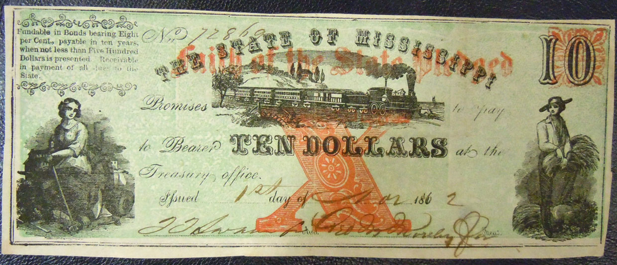 Left: 1862 State of Mississippi $10 note or bond.