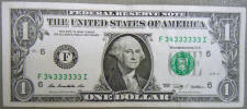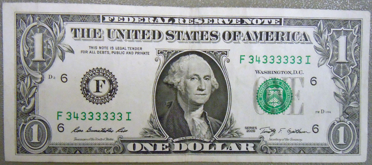 Right: Series of 2009 $1 bill (FRN) with seven 3's in the serial number.