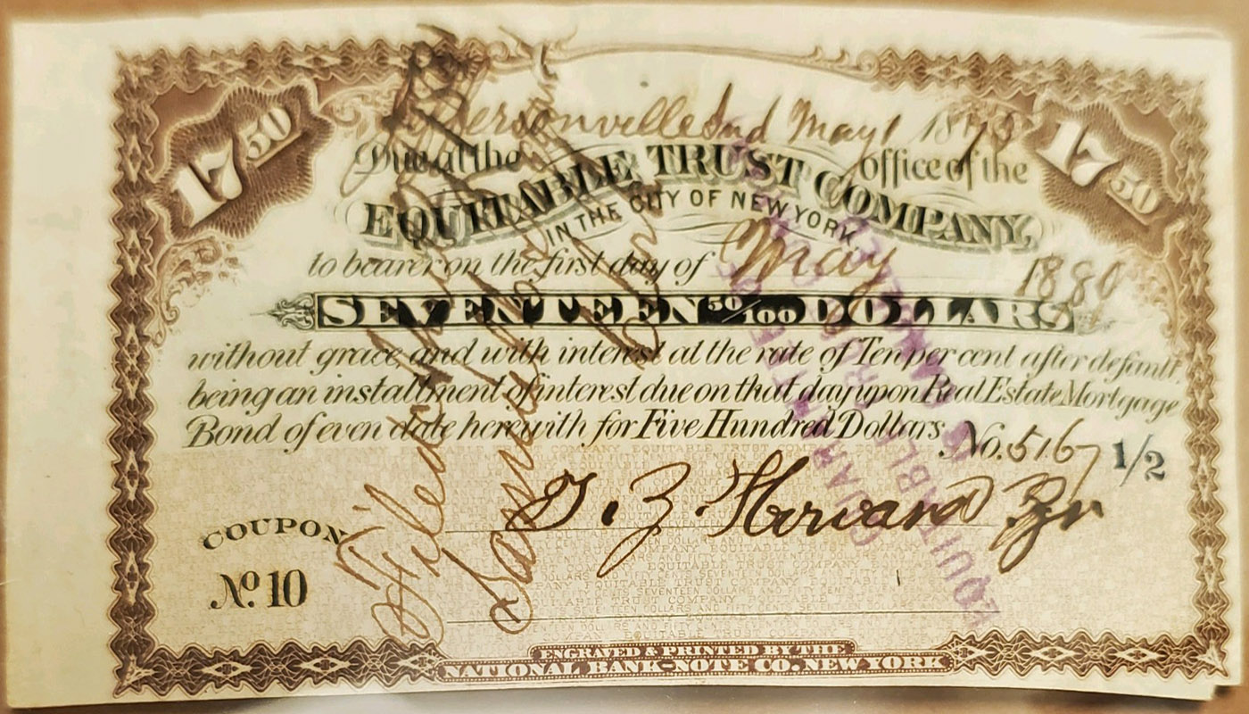 Left: Equitable Trust Company, New York, dated May 1880, $17.50 coupon on a real estate mortgage bond.