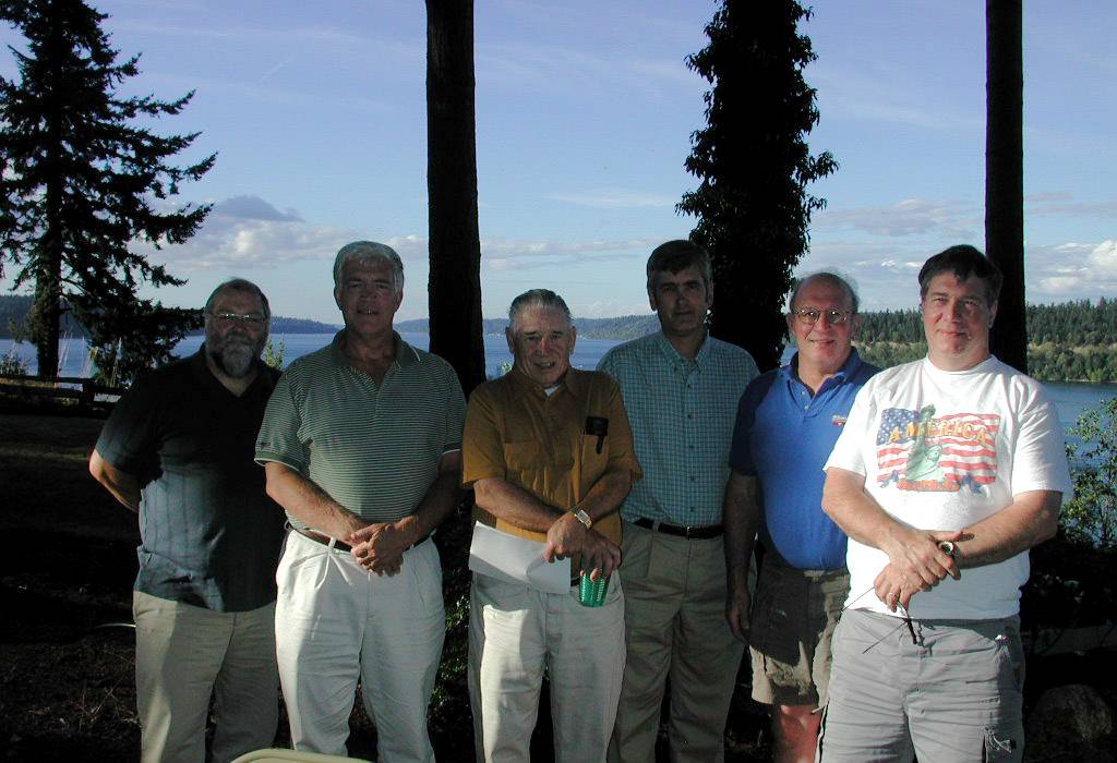 TLCC July Board Meeting & Party (right) – The July 20, 2004 board meeting and club dessert party was held at Dave's scenic waterfront location in Gig Harbor. Shown here are members present for the outdoor board meeting! See the July exhibit page for the identity of the persons in this photo, along with "talent show" photos!!