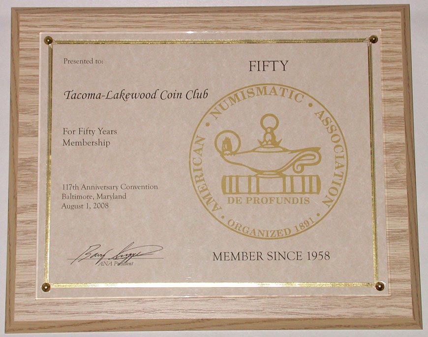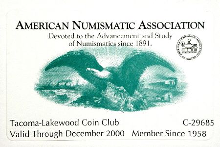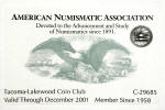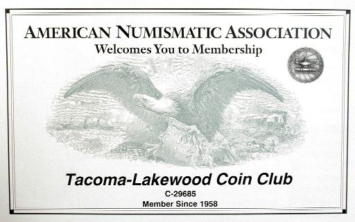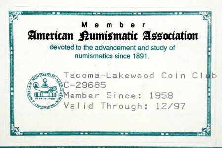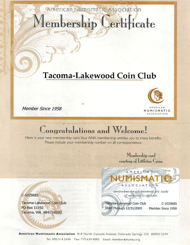 | ANA membership cards/certificates from the current Tacoma-Lakewood Coin Club are numbered Cyy-1. Other ANA certificates (such as the appreciation certificate shown) are numbered Cyy-2. | |||