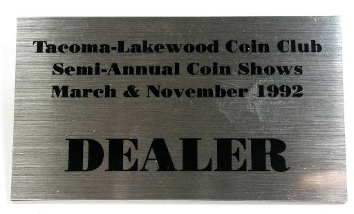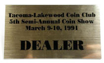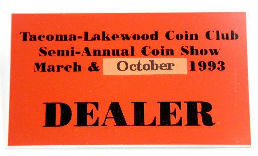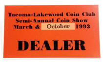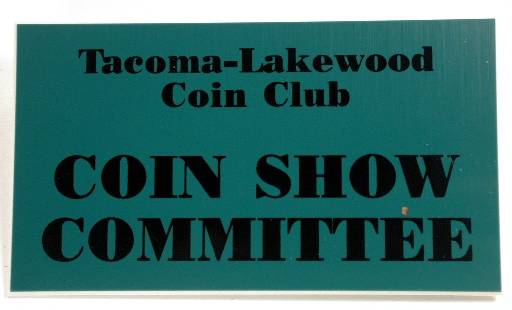 Tacoma-Lakewood Coin Club Show badge (2 x 3.5 inches, silver with black