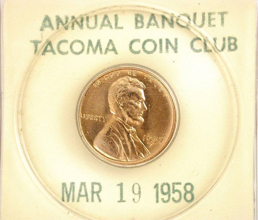 S58-1 banquet favor with 1957-D Lincoln Cent 2 x 2 inch plastic holder with yellow backing and green lettering March 19, 1958 banquet, Tacoma, Washington 2 known |