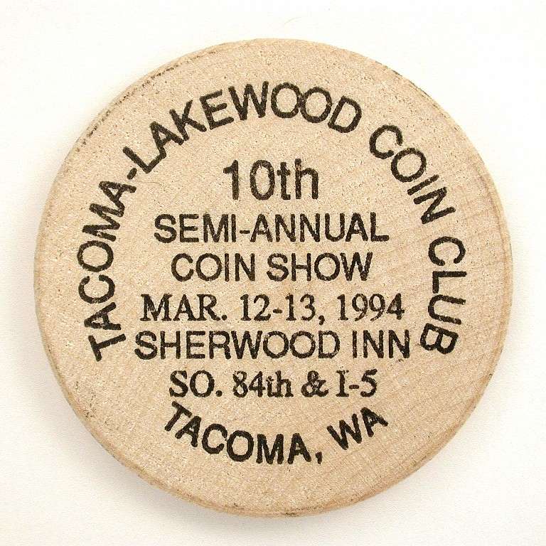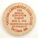 S94-3 wooden nickel, 38 mm TLCC 12th Semi-Annual Coin Show, November 6, 1994, Tacoma, Washington Red obverse and reverse, 1,000 made |