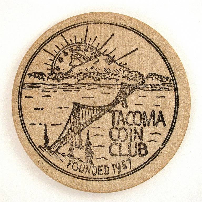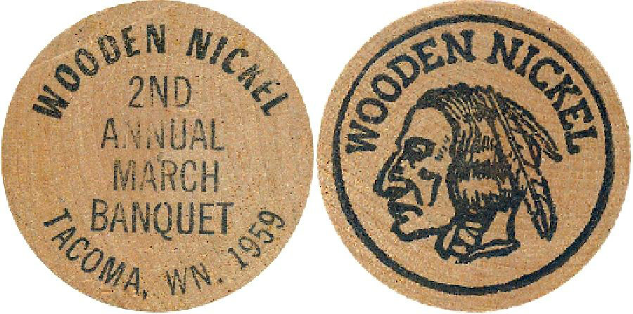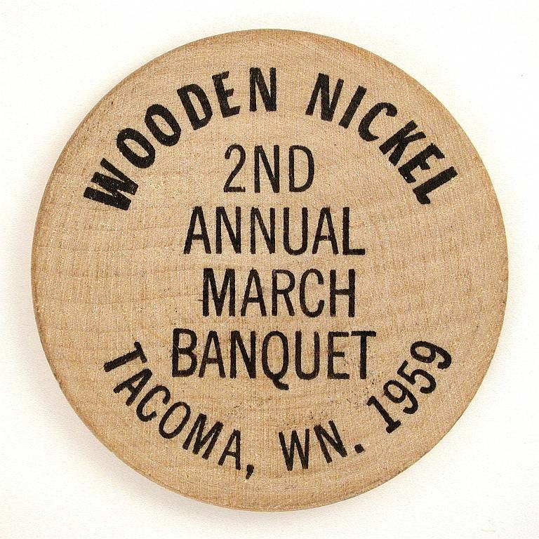 S59-2a wooden nickel, 38 mm 2nd Annual March banquet, Tacoma, Washington 5 known Notice the abbreviation "WN." for Washington that was in use at that time! |