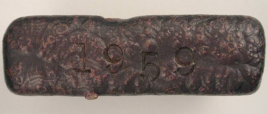 ![]() 1959S59-3 TCC copper ingot, 48 x 19 x 15 mm (approx) Number 20 of 25 made; the 2nd known example; shown at Aug. 2009 meeting. |