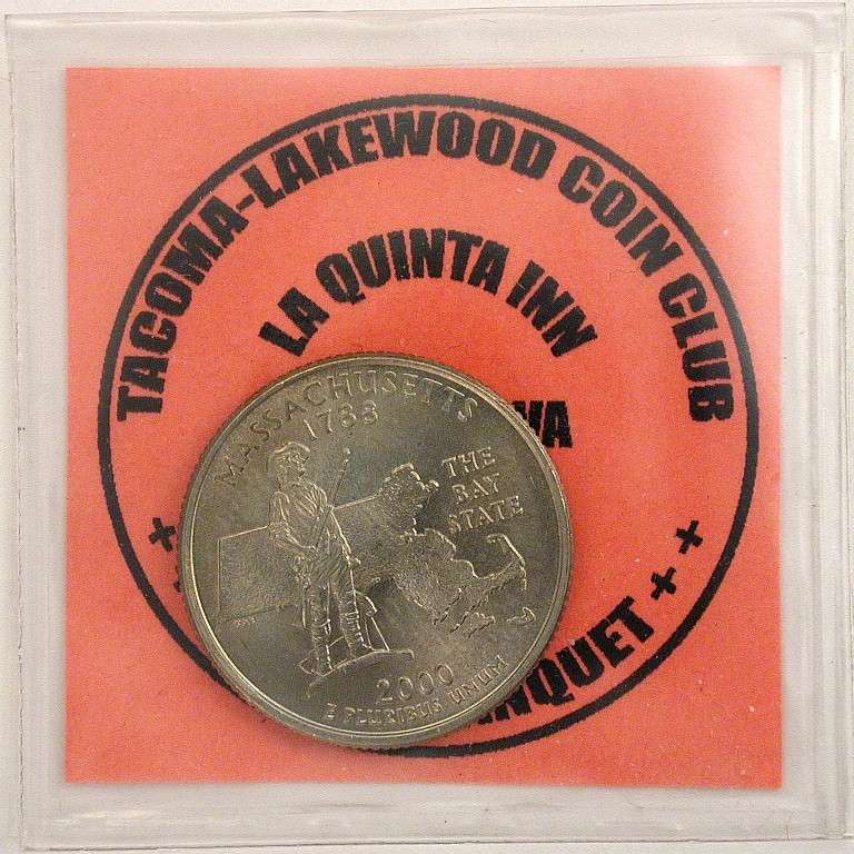 S00-1 banquet favor with 2000-P Massachusetts State Quarter in a 2 x 2 inch flip with a 1¾ inch square insert TLCC Annual Banquet, February 1, 2000, Tacoma, Washington |