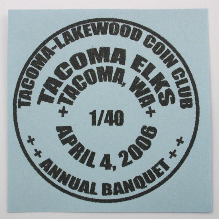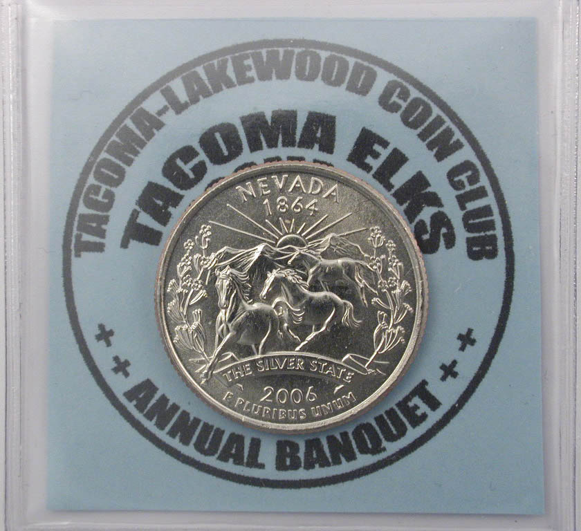 S06-1 banquet favor with 2006 Nevada Quarter in a 2 x 2 inch flip with a 1¾ inch square insert TLCC annual banquet, April 4, 2006, Tacoma, Washington (Tacoma Elks Lodge) |