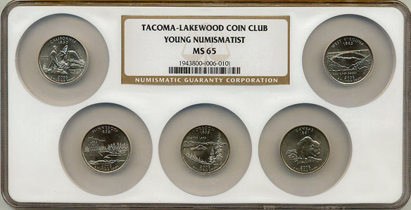 2006S06-2 TLCC Young Numismatist set of 2005 quarters in NGC multi-coin holder graded MS 65 (courtesy of NGC at the request of Norm Mikat). Quantity: 10 sets received April 2006 (one in club collection; remainder available to YN's based on merit or as decided by the board of directors). |