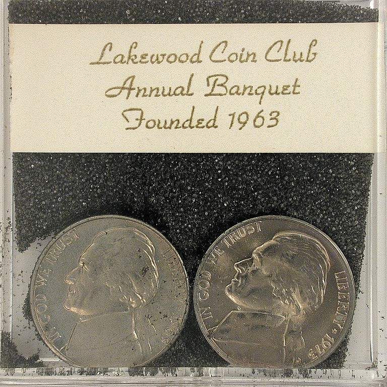 S73-1 banquet favor with 1963 (D?) and 1973-D Jefferson Nickels on black foam in a 2-1/8 inch square hinged plastic holder with snap closure. Lakewood Coin Club Annual Banquet, 1973 |
