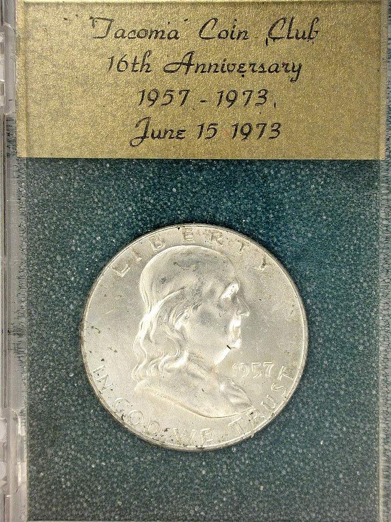 S73-2 banquet favor with 1957 (D?) Franklin Half on dark green foam in a 2-1/8 x 3 inch hinged plastic holder with snap closure. Tacoma Coin Club 16th Anniversary Banquet, June 15, 1973 |