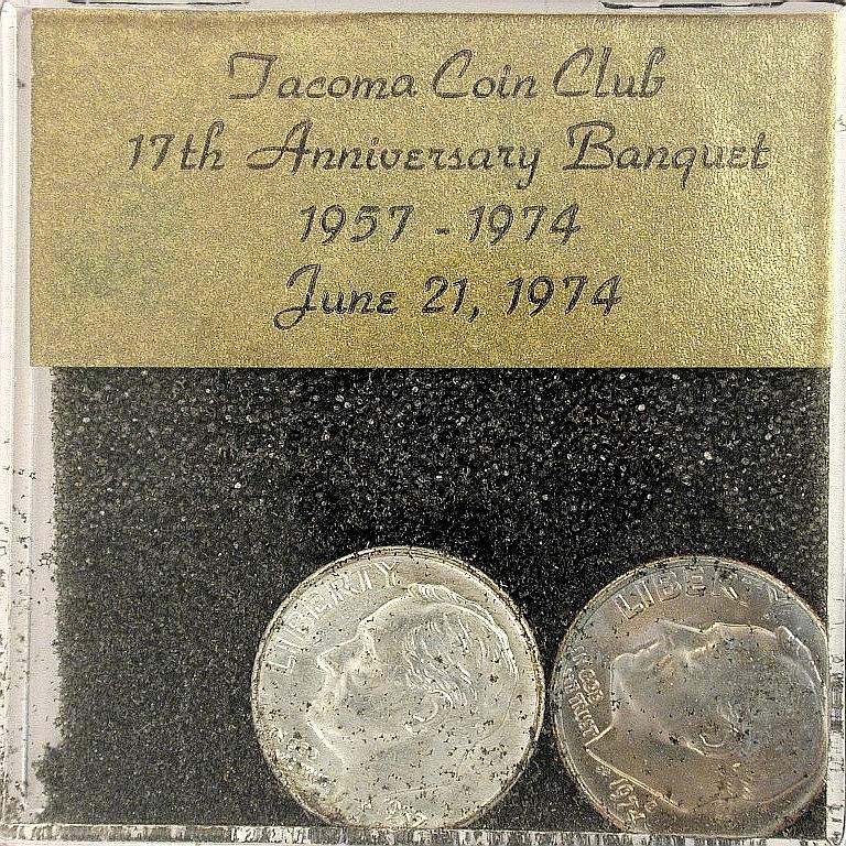 S74-2 banquet favor with 1957-D and 1974-D Roosevelt Dimes on black foam in a 2-1/8 inch square hinged plastic holder with snap closure. Tacoma Coin Club 17th Anniversary Banquet, June 21, 1974 |