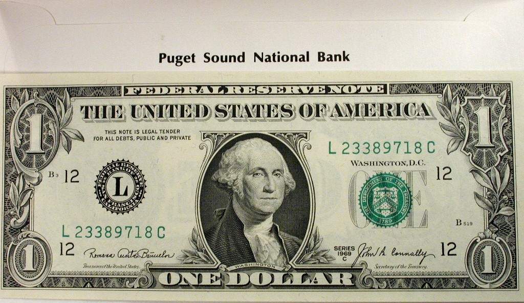 1975 S75-2 banquet favor. Inner envelopes contain Series 1969C $1 Federal Reserve Notes with serial numbers L23389700C to 799C (100 made), 3-1/8 x 6½ inches Tacoma Coin Club 18th Anniversary Banquet, June 20, 1975, Tacoma, Washington |