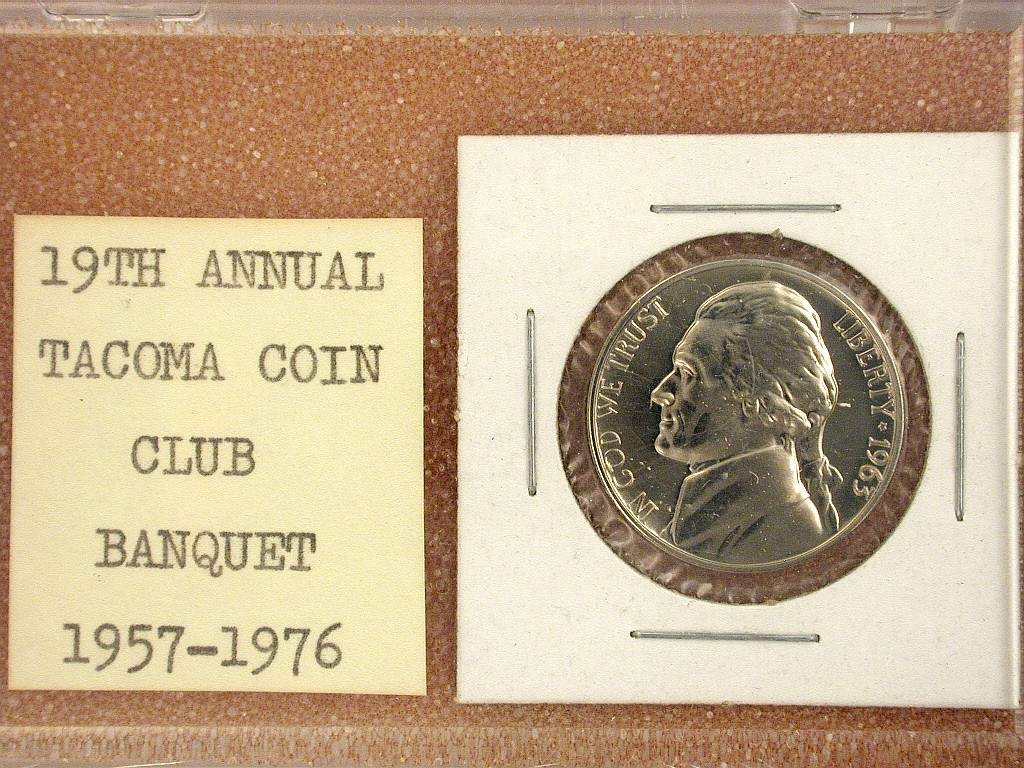 S76-1b banquet favor with 1963 proof Jefferson Nickel in a cardboard holder on tan foam in a 2-1/8 x 3 inch hinged plastic holder with snap closure. 19th Annual Tacoma Coin Club Banquet, 1976 |