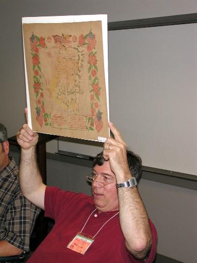 Left: Dave Schmidt holding handkerchief from 1909 Alaska-Yukon-Pacific (AYP) Exposition in Seattle. Center/right: AYP "silver" award medal.