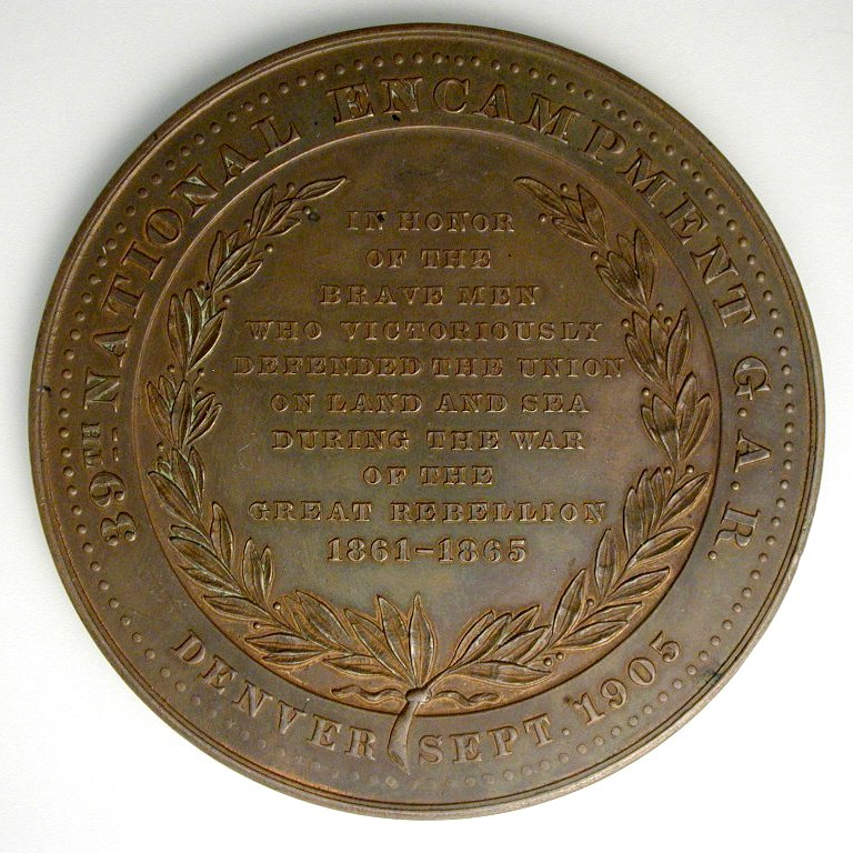Left: Pikes Peak G.A.R. National Encampment medal, 1905. Right: USS Constellation 20th Anniversary medal, 1961-1981.