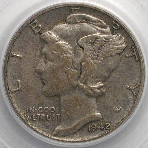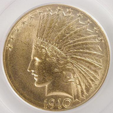 Left to right: 1942/1-D Mercury Dime PCGS XF-40, 1910-D Indian $10 gold piece, PCGS MS-63.