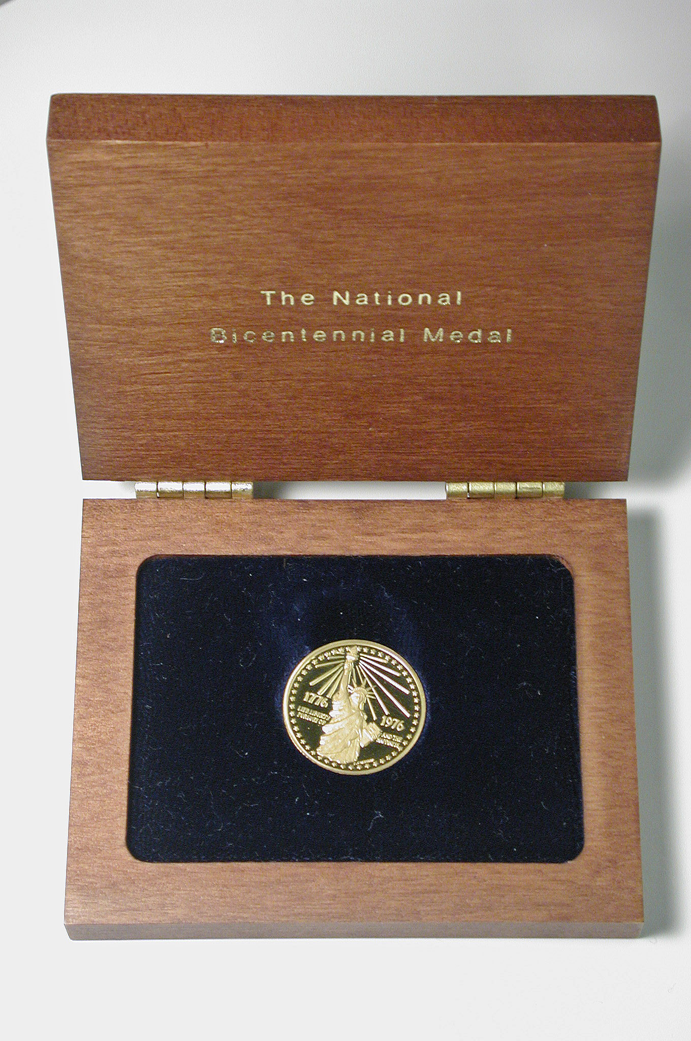 Left: The National Bicentennial Medal. Center/Right: Green River Whiskies lucky medallion.