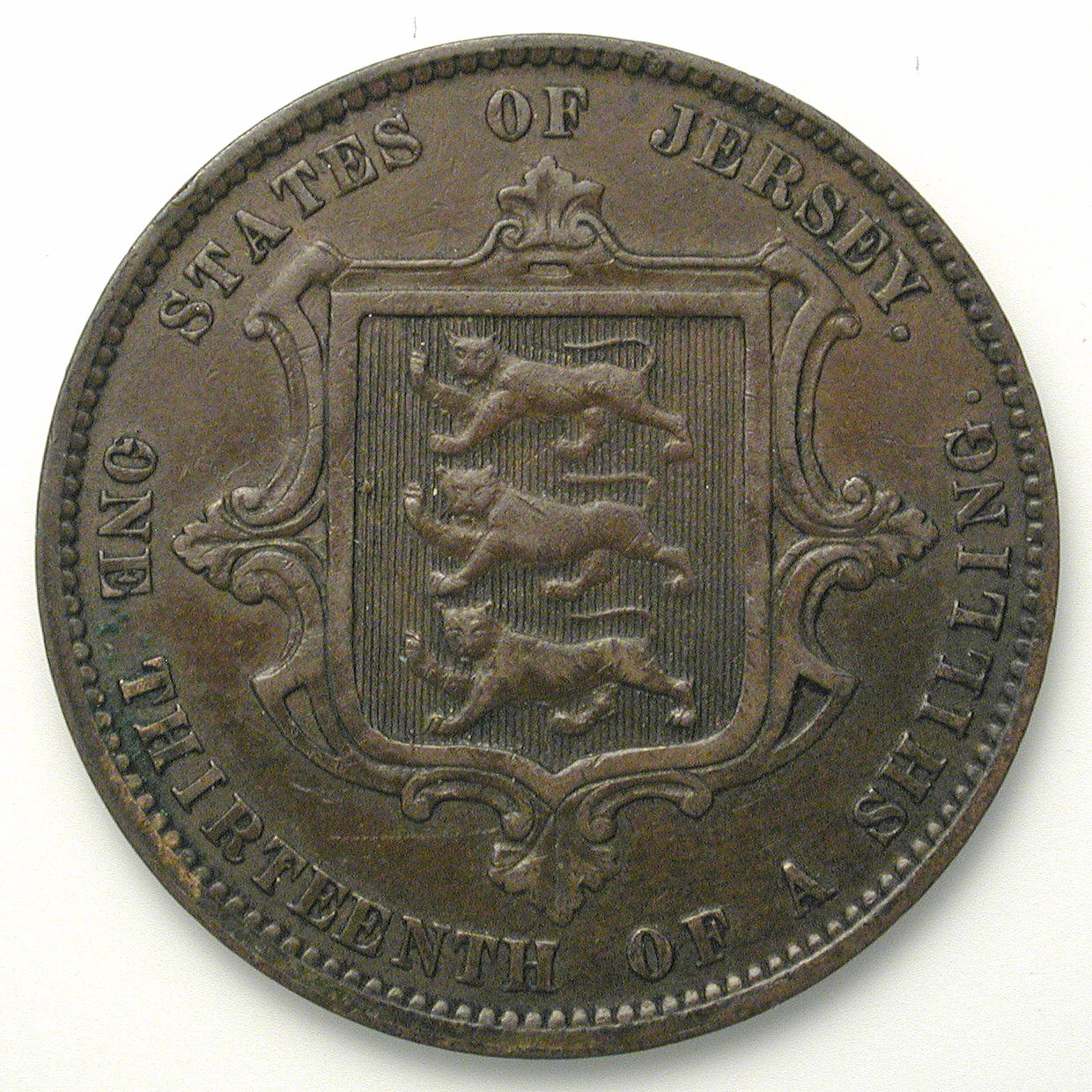 Right: 1870 States of Jersey 1/13 shilling, Queen Victoria.