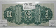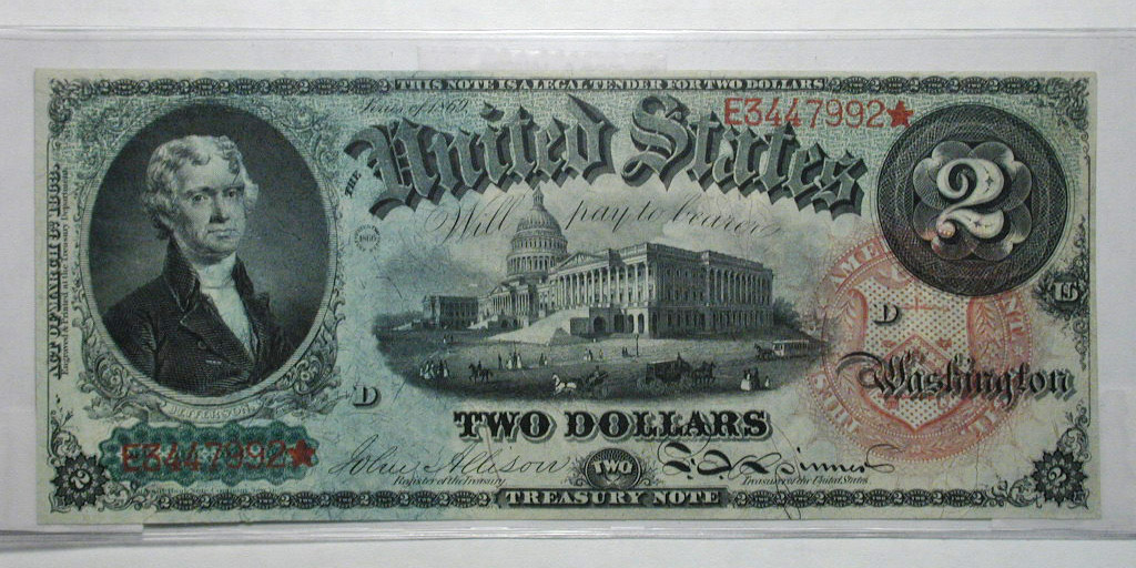 Top: 1863 US $2 "rainbow" note. Bottom: 1899 US $1 "black eagle" silver certificate.